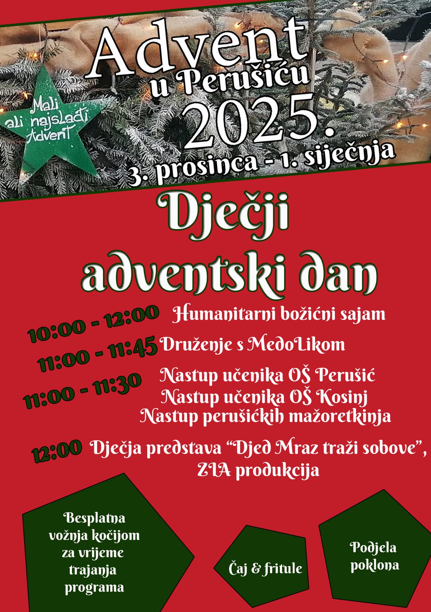 Od 10 sati park postaje mjesto po želji svakog djeteta, uz fritule i topli čaj održat će se Božićni sajam na kojem će svoje radove izložiti učenici i učitelji OŠ Perušić, OŠ Kosinj i JU Narodna knjižnica Općine Perušić. Bogat program upotpunit će nastupi učenika općinskih osnovnih škola, nastup mažoretkinja te dječja predstava „Djed Mraz traži sobove“ u izvedbi ZIA produkcije.