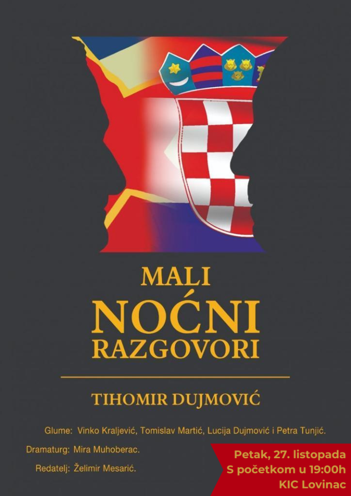 Kulturno informativni centar Lovinac poziva vas na predstavu „Mali noćni razgovori ljevice i desnice“ u petak, 27. listopada s početkom u 19:00h.