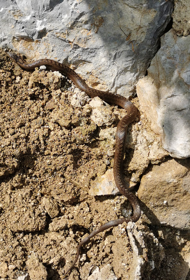 Zmija je bila dugačka skoro 25 centimetara i odmah je nestala kada nas je vidjela. To je mlada ribarica ili kockasta vodenjača, vrste vodene zmije čija je kamuflaža na koži često stoji života. Neupućeni je zamjenjuju s vrlo otrovnim poskokom čija je cik-cak šara drukčija, ali su u „strahu velike oči“ pa ceh obično plaćaju neopasne ribarice.
