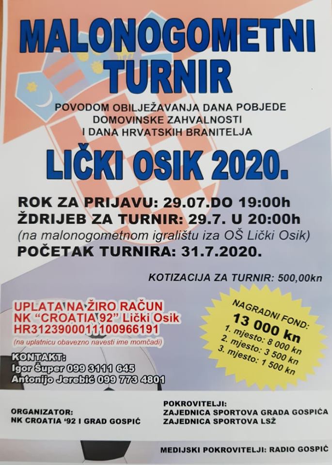 Pridržavajući se svih mjera preporuka od strane Stožera Civilne zaštite organizator NK “Croatia 92” najavljuje tradicionalni malonogometni turnir u Ličkom Osiku.
