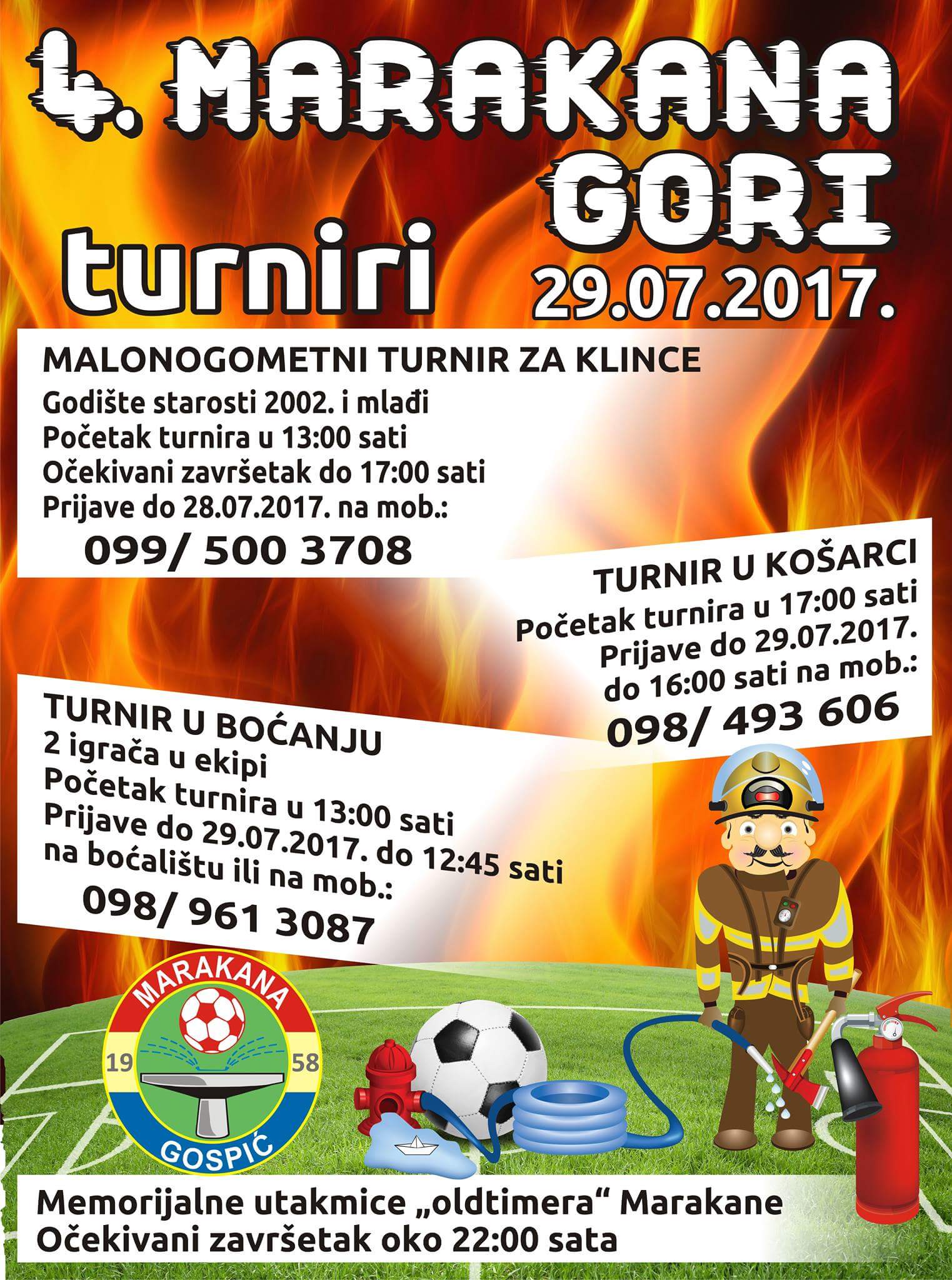 Po četvrti puta za redom održava se manifestacija „Marakana gori!“ Udruga „Marakana“ iz Gospića za ovaj je vikend priredila tri sportska događaja. Tako će se 28. srpnja održati Malonogometni turnir za klince, kada se od 13 sati na Marakani okupiti dječaci uzrasta 2002. i mlađi. U subotu, 29. srpnja svjedočit ćemo turniru u košarci. Ekipe će se okupiti u 17 sati. Istoga dana održat će se turnir u boćanju s početkom u 12.45 h. Posebno atraktivne bit će utakmice oldajmera Marakane, o čijim detaljima ćemo vas izvještavati.