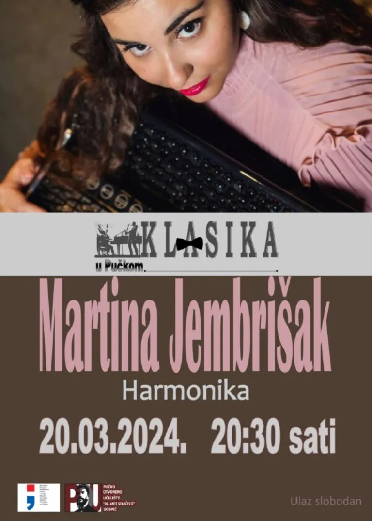 Martina Jembrišak (Zagreb, 1995.) diplomirana je harmonikašica koja svojim inovativnim repertoarom i aranžmanima proširuje harmonikaški opus zahvaljujući brojnih koncertnim turnejama i suradnjama sa suvremenim skladateljima. Vrlo mlada odlazi na studij u Varšavu (Uniwersytet Muzyczny Fryderyka Chopina) od kada joj putovanja nisu strana: osim u Hrvatskoj, nastupa na brojnim turnejama u Europi, Aziji i Africi. Uz četrdesetak inozemnih nagrada, svakako treba izdvojiti hrvatsku nagradu Ivo Vuljević za najuspješniju glazbenicu 2020. godine. Iako njezin repertoar obuhvaća sva stilska razdoblja, valja posebno istaknuti njezinu intenzivnu suradnju sa suvremenim skladateljima zahvaljujući kojoj su nastale brojne skladbe za harmoniku posvećene upravo njoj, čime je ova mlada umjetnica izuzetno proširila harmonikaški repertoar.