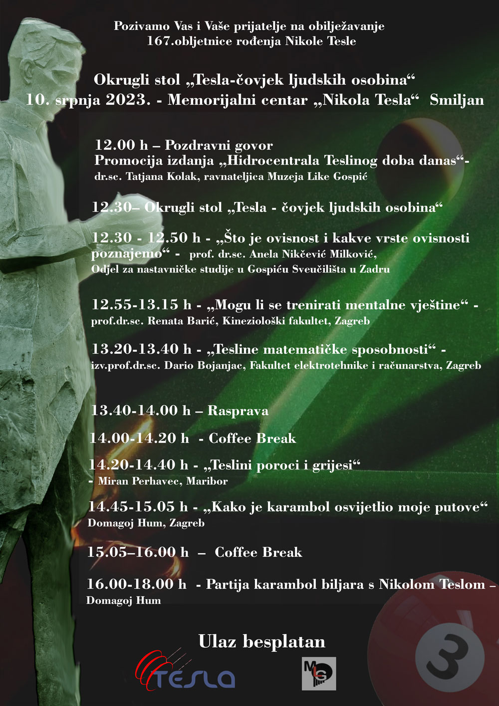 16.00-18.00 h  – Partija karambol biljara s Nikolom Teslom – Domagoj Hum