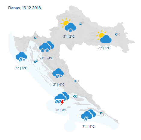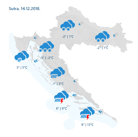 Oblačno, na Jadranu uz kišu, a na kopnu snijeg, češći i obilniji u drugom dijelu dana. Mjestimice će se stvoriti i deblji snježni pokrivač, posebice u gorju. Snijega nošenog vjetrom može biti i na sjevernom Jadranu, a navečer ponegdje u unutrašnjosti Dalmacije i malo kiše koja se smrzava u dodiru s hladnim tlom. U Dalmaciji je lokalno moguća obilnija oborina praćena grmljavinom. Puhat će povremeno umjeren sjeveroistočnjak, na Jadranu i jaka bura, s olujnim udarima i istočnjak, na jugu i jugo. Najniža temperatura uglavnom od -5 do -1, na Jadranu između 3 i 8. Najviša od -2 do 2, na Jadranu od 4 do 10 °C. Na jugu toplije.