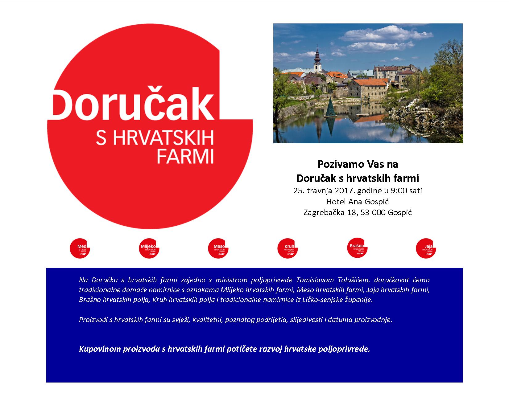 Promocija hrvatskih poljoprivrednih proizvoda pod nazivom “Doručak s hrvatskih farmi” koju organizira Hrvatska poljoprivredna agencija  narednog utorka, 25. travnja održat će se u gospićkom hotelu “Ana” s početkom u 9 sati. U sklopu ovoga događaja bit će poslužene tradicionalne hrvatske namirnice: mlijeko i mliječni proizvodi, meso, kruh, peciva i jaja, isključivo proizvodi s oznakama Mlijeko hrvatskih farmi, Meso hrvatskih farmi, Jaja hrvatskih farmi,Med iz lijepe naše, Kruh hrvatskih polja, Brašno hrvatskih polja, a koje će omogućiti domaći proizvođači i prerađivači, korisnici oznaka.