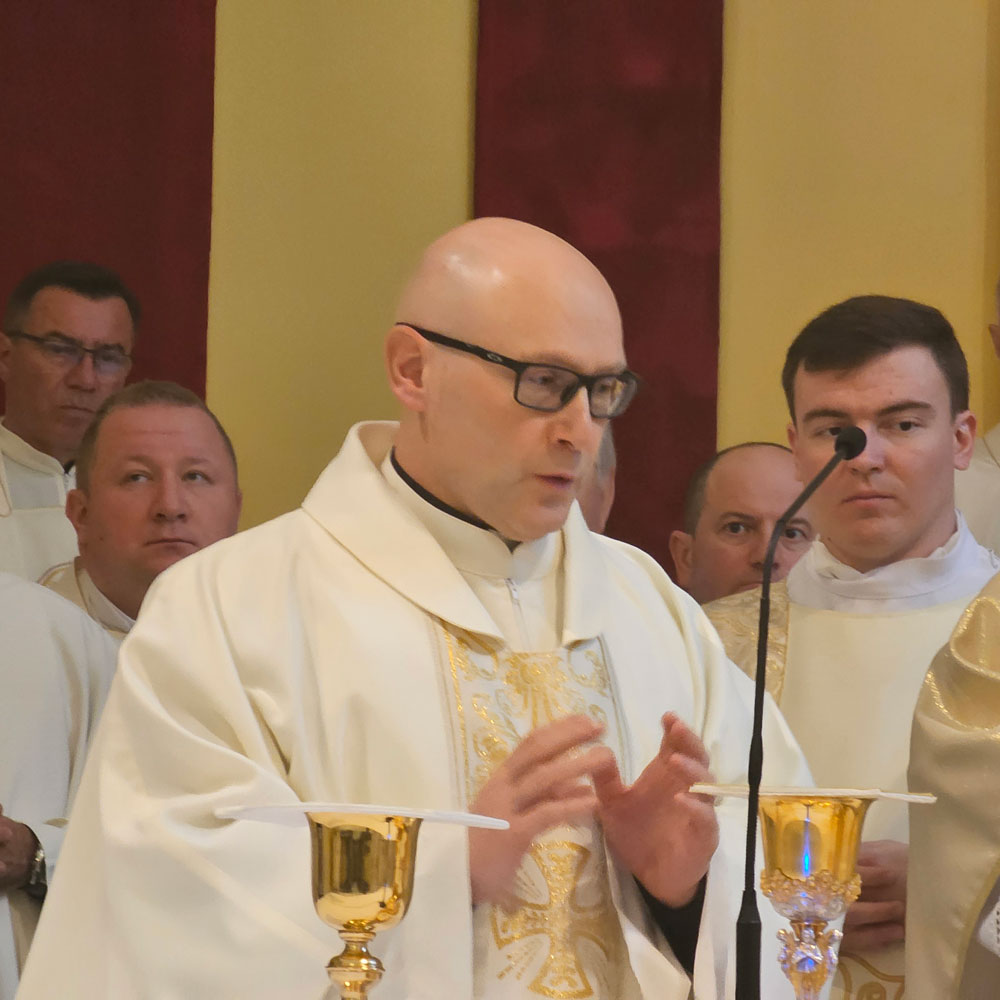 Na početku svete mise,sve okupljene a posebno mons. Rogića, pozdravio je dijecezanski upravitelj mons. Richard Pavlić. U svojoj homiliji biskup Rogić spomenuo se kako je danas Sveta misa posvete ulja krizme i bolesničkog pomazanja koja okuplja cijeli prezbiterij ove biskupije. “Danas smo svi zajedno oko našeg Učitelja, oko jedinog Velikog Svećenika, oko Isusa Krista koji je postao i žrtvenik i žrtva, te prinesao samoga sebe za naše spasenje.” Obratio se i svim prisutnim svećenicima podsjećajući ih njihovu posvećenu službu: “Posvećivanjem života Bogu i spasu braće postajati slika samoga Krista, postojano svjedočeći ljubav i vjernost. Koji izazov! Nema većega. A Bog ga je ponudio nama. Puno puta toga nismo svjesni. Zato je danas dan kada obnavljamo svoja obećanja, svoj DA, svoj HOĆU bit Božji u njegovoj službi. Odricanjem sebe suobličavati se Njemu, radosno vršeći svoju službu vođeni revnošću za duše.”