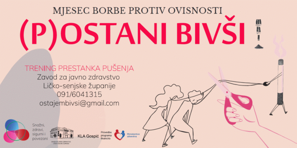 Upravo u Mjesecu borbe protiv ovisnosti kreće kampanja promocije „TRENINGA PRESTANKA PUŠENJA“ u kojoj će se intenzivirati informiranje javnosti o dostupnosti ove usluge na lokalnoj razini svima koji razmišljaju o tome da odbace cigaretu te ih potaknuti da ustraju u ostvarenju svoje odluke. Prestanak pušenja zahtjevna je zadaća, koju najčešće treba ponoviti više puta da bi se konačno prestalo pušiti. U prosjeku pušači imaju oko sedam neuspješnih pokušaja različita trajanja, dok konačno ne postignu dugotrajnu ili stalnu apstinenciju. Prilikom pokušaja prestanka pušenja postoje dvije vrste čimbenika koji ometaju sam prestanak pušenja. Na prvom mjestu to je potreba za nikotinom kao vrlo adiktivnom tvari, koja je glavni psihoaktivni sastojak duhana. Potreba za nikotinom nakon prestanka pušenja nije dugotrajna, ona nestaje relativno brzo, a bivše pušače prema ponovnom početku konzumiranja duhana vode tzv. okidači, odnosno ponašanja i navike povezani s pušenjem. Kroz „Trening prestanka pušenja“ pušače uz motiviranje za prestanak pušenja detaljno upoznajemo s procesom prestanka pušenja, okidačima i aktivnostima kojima mogu eliminirati učinak okidača, tako da je veća vjerojatnost da će ustrajati u apstinenciji.