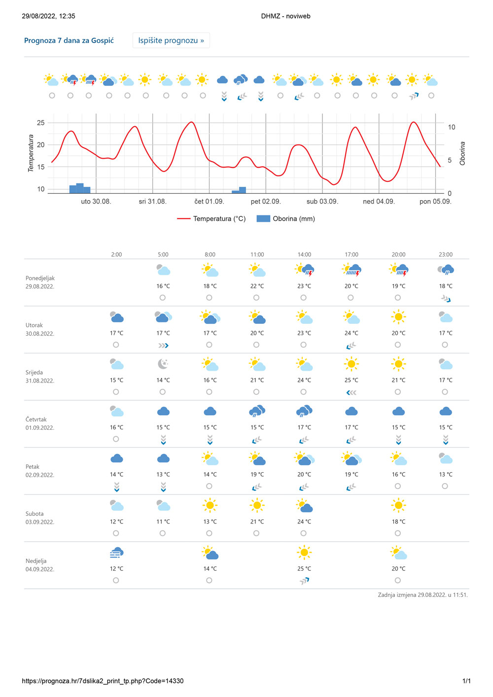 Djelomice, ponegdje i pretežno sunčano. Na istoku zemlje oblačnije, mogući su lokalni pljuskovi, a malo kiše može pasti i u unutrašnjosti Istre i Dalmacije. Ujutro po kotlinama gorskih predjela i uz rijeke može biti kratkotrajne magle. Vjetar uglavnom slab, ponegdje umjeren sjeverozapadni, ujutro duž obale burin. Najniža temperatura zraka od 14 do 18, na Jadranu od 20 do 23, a najviša dnevna uglavnom između 27 i 31 °C.