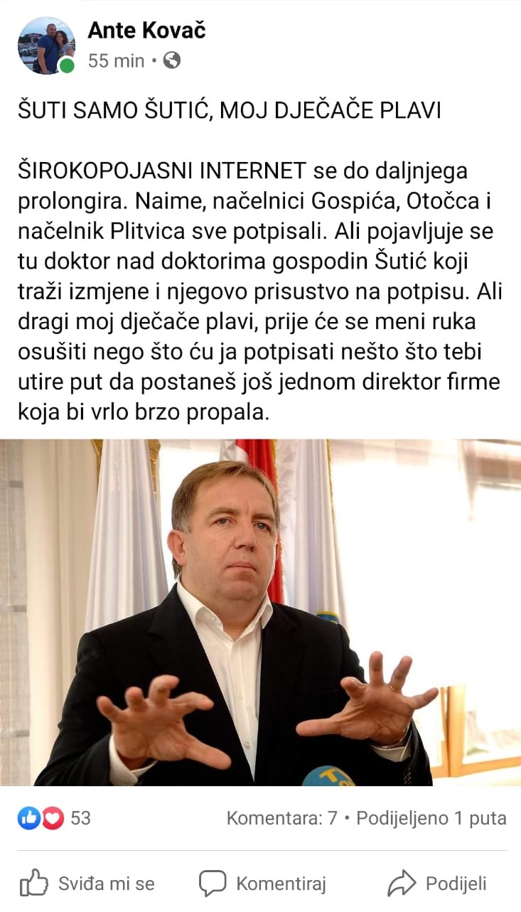 Očito priča oko širokopojasnog interneta poprima čudne tokove zbog upletenosti Šutića koji inzistira biti na potpisima ugovora. Priprema li se direktorsko mjesto za Šutića ili zamjenika gradonačelnika Ivicu Tomljenovića Goluba. O tome progovara načelnik Plitvičkih Jezera Ante Kovač.