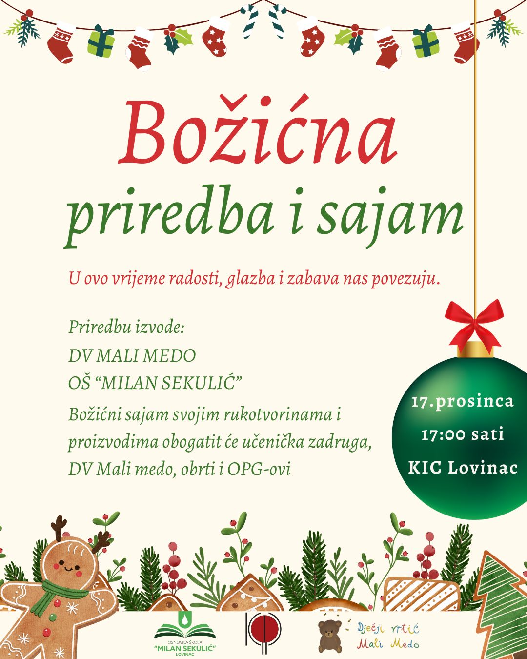 Zahvaljujući suradnji s osnovnom školom “Milan Sekulić” i dječjim vrtićem “Mali medo” iz Lovinca, dvorana će biti puna radosti, smijeha, dječjih božićnih izvedbi, ali i divnih proizvoda vrijednih ruku. Nakon održanih kreativnih radionica, na našem malom božićnom sajmu radove i ukrase će na štandovima izložiti školska učenička zadruga, DV Mali medo i KIC. Lokalni obrti i OPG-ovi će sve zaokružiti ponudom slatkiša, kolača, raznih prerađevina i pića.