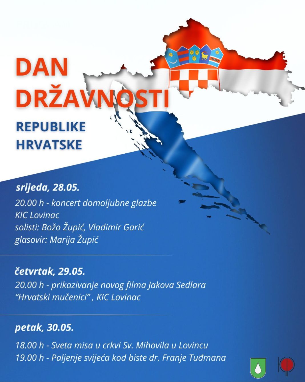 Općina Lovinac, Kulturno informativni centar Lovinac i Župa Sv. Mihovil Lovinac pozivaju vas da trodnevnim programom zajedno dostojanstveno obilježimo Dan državnosti Republike Hrvatske.