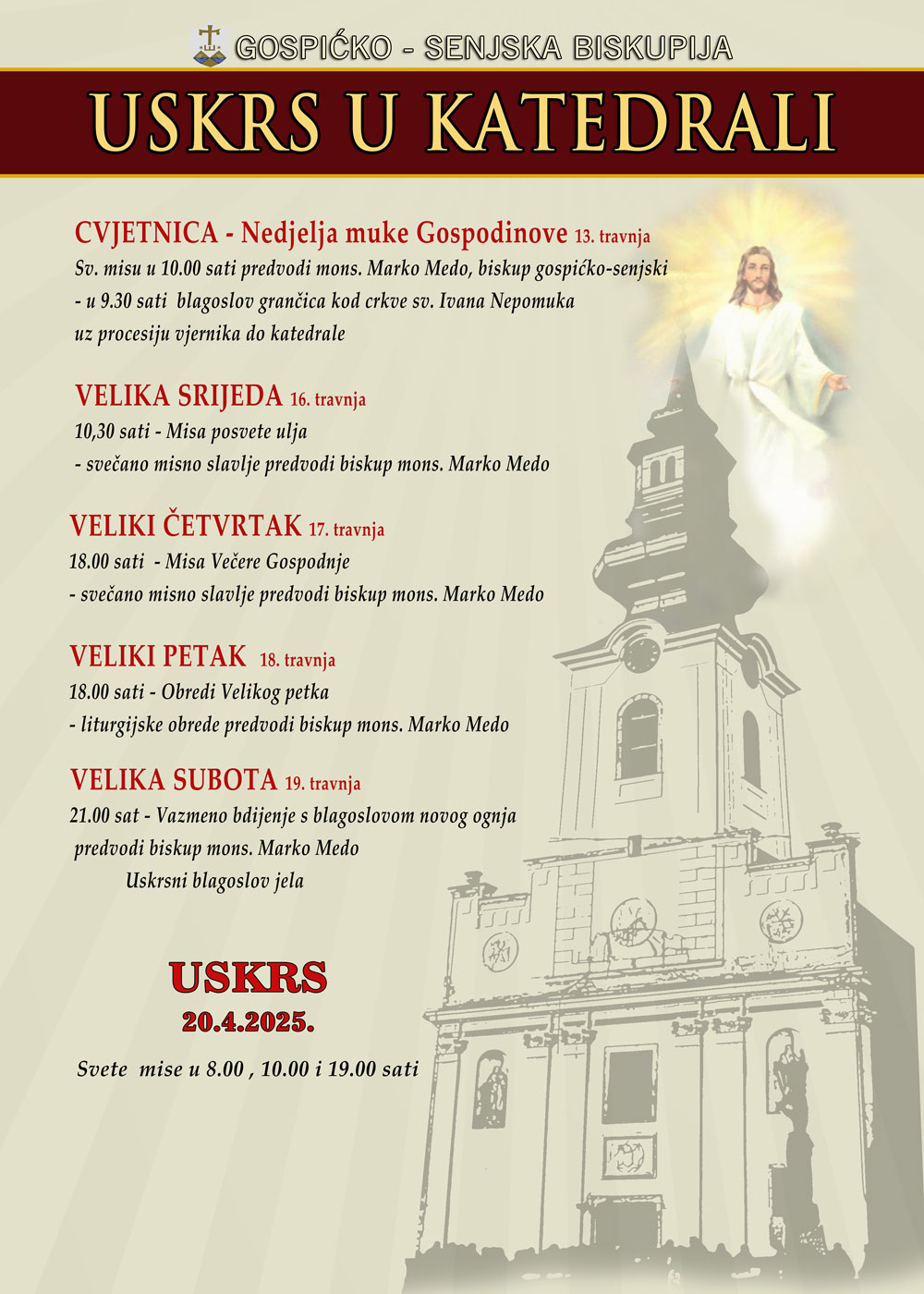 - Velika subota – 19. travnja, svečano vazmeno bdjenje s blagoslovom novog ognja u gospićkoj katedrali Navještenja BDM u 21 sat predvodit će gospićko-senjski biskup mons. Marko Medo.