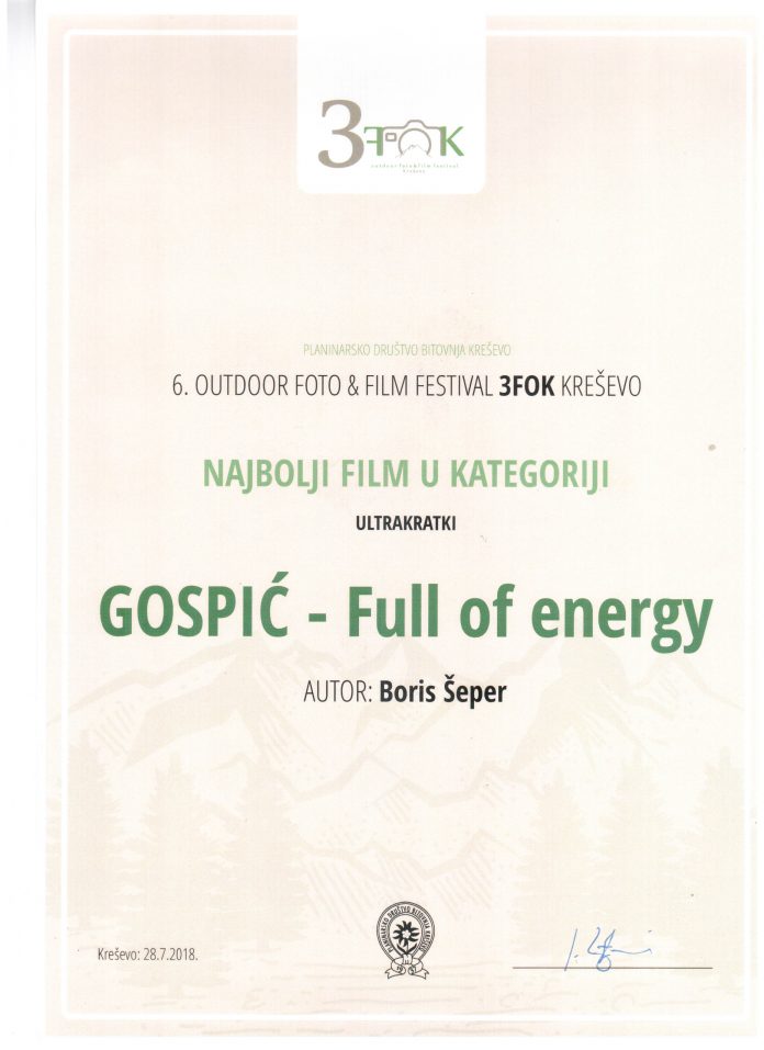 Promotivni turistički film Turističke zajednice Gospić “Gospić-full of energy” osvoji je prvo mjesto odnosno Gran prix za najbolji kratki outdoor film.