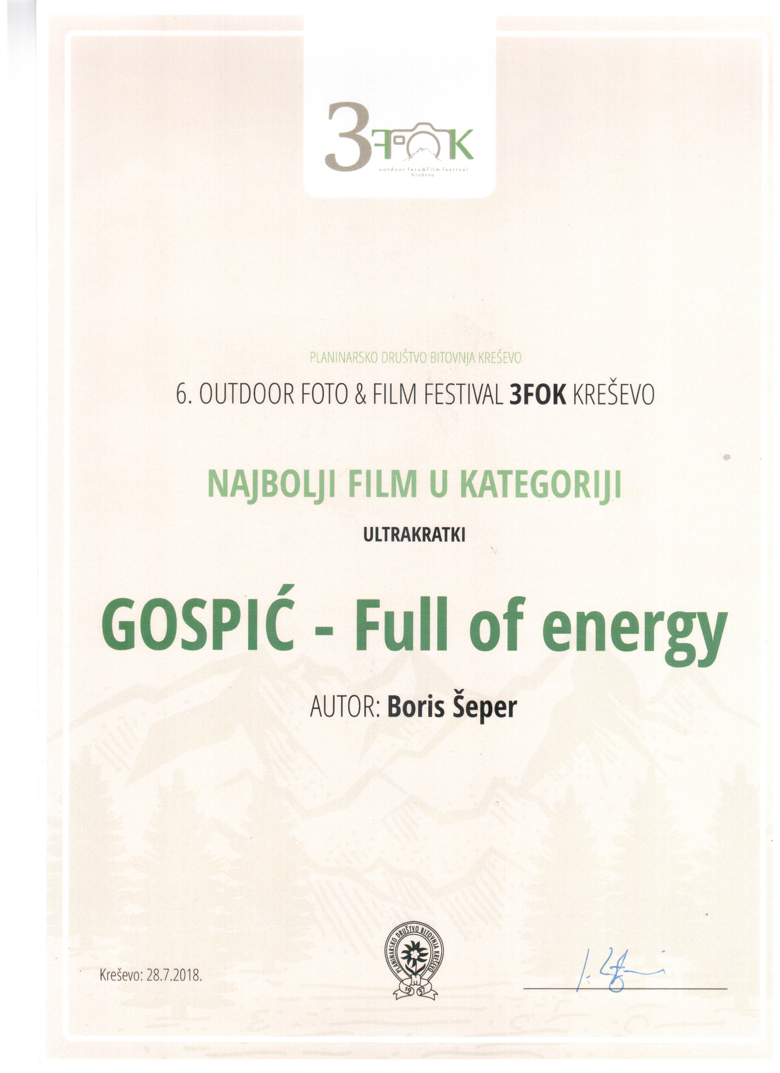 Film Turističke zajednice Gospić “Gospić-full of energy” osvoji je prvo mjesto odnosno Gran prix za najbolji kratki outdoor film.