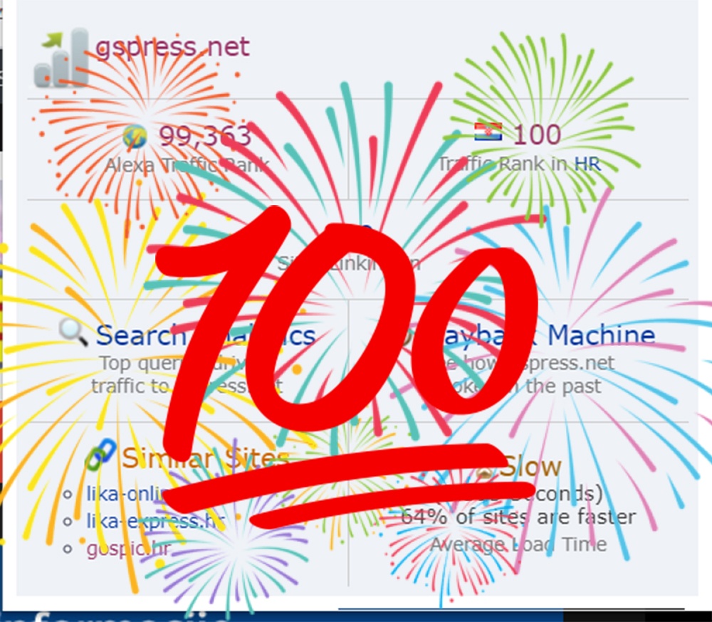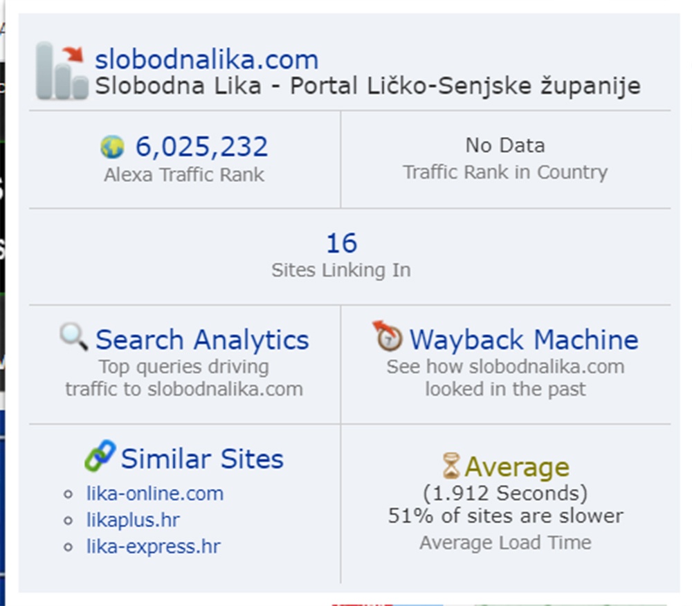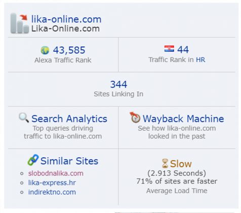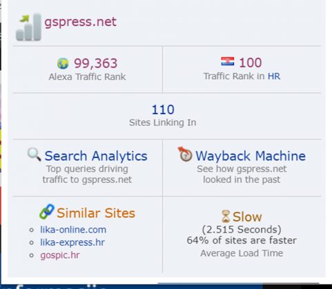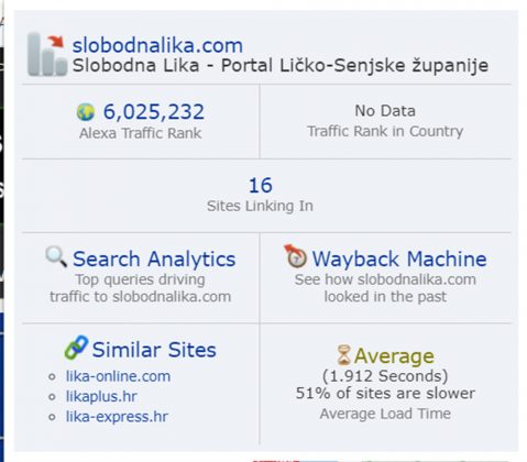 Osim uvijek najčitanijeg ličkog medija Lika online, naš portal se od danas uključio u popis TOP-100 hrvatskih elektroničkih medija! Na ovaj način moramo razgolititi istinu svih ostalih „najčitanijih“ ličkih portala od kojih se većina ne može naći niti u društvu portala od 10 000. mjesta na više. Drago nam je što su čitatelji prepoznali naš rad i nastojanja da im prenosimo pravodobne i točne informacije. Bez nekima omiljenog copy-paste novinarstva  kojega mogu preferirati i mala djeca. Da nema web-stranica jedinica lokalne samouprave i pojedinih institucija, takvi „rasni novinari“ ne bi opstali niti jedan dan.