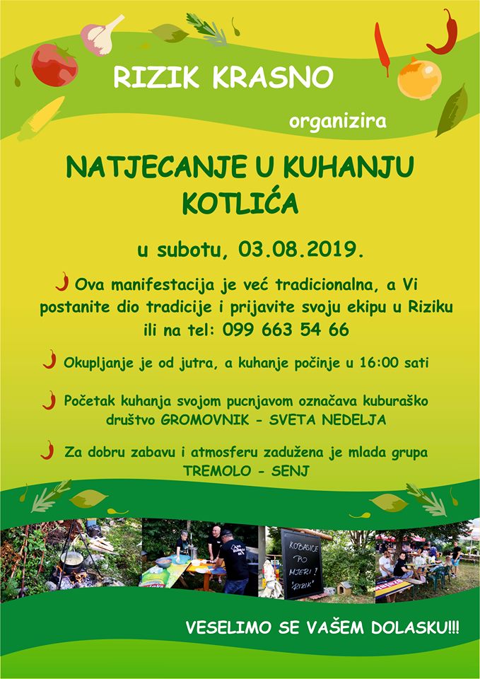 T.U.O. Rizik iz Krasna već šestu godinu za redom organizira natjecanje u kuhanju kotlića. Tako će biti i ove godine. Natjecanje će se održati u subotu 3. kolovoza ispred ugostiteljskog objekta Rizik.  Okupljanje ekipa počinje od jutra, a samo natjecanje u 16 sati.