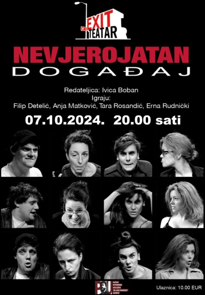 U samo jednoj večeri provedenoj sa likovima „Nevjerojatnog događaja“ razmislit ćete o svojim manama i slabostima, banalnostima života, a istovremeno se nasmijati do suza. Kada se katarza doživi kroz smijeh, to je posebno dirljiv trenutak kazališta. Pogledajte ovu predstavu i uvjerite se sami.