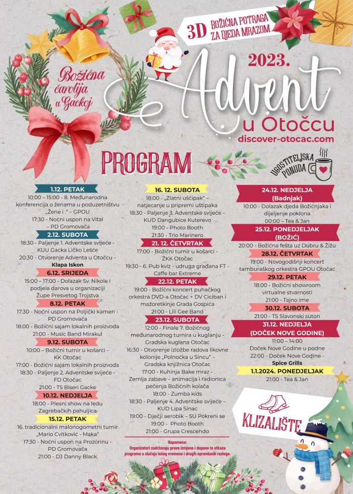 Program započinje 1. prosinca 8. Međunarodnom konferencijom o ženama u poduzetništvu „Žene i .“ koju organizira Hrvatska gospodarska komora – Županijska komora Otočac, a 2. prosinca slijedi otvorenje Adventa uz Koncert Klape Iskon,  dok će Otočane i goste u Novu godinu uvesti band Spice Grills.