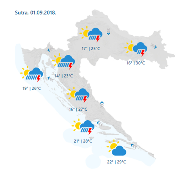 Promjenjivo i nestabilno uz povremenu kišu i pljuskove s grmljavinom, osobito na sjevernom Jadranu te u gorskoj i središnjoj Hrvatskoj. Najmanje oborine očekuje se na jugu Dalmacije gdje će se veći dio dana zadržati pretežno sunčano. Na kopnu će poslijepodne zapuhati umjeren sjeverni i sjeveroistočni vjetar, a na Jadranu jugo koje će na sjevernom dijelu okrenuti na buru. Najniža jutarnja temperatura zraka na kopnu od 12 do 17, na Jadranu od 18 do 23, a najviša dnevna na zapadu od 21 do 26, u Dalmaciji i na istoku zemlje od 25 do 30 °C.