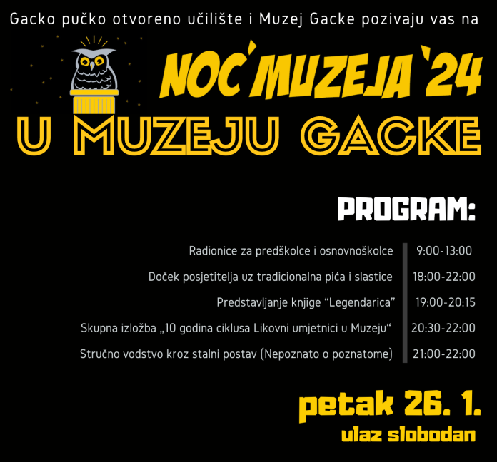 Noć muzeja u Muzeju Gacke održat će se 26. siječnja 2024. od 18 do 22 sata, uz jutarnji edukativni program namijenjen predškolcima i osnovnoškolcima. Ovu manifestaciju devetnaesti put organizira Hrvatsko muzejsko društvo u suradnji s brojnim hrvatskim muzejima i drugim baštinskim, znanstvenim i obrazovnim institucijama. Tema devetnaeste Noći muzeja – MUZEJI I NOVA PUBLIKA – odgovara vremenu traženja novih muzejskih sadržaja u čijem kreiranju i publika može sudjelovati.