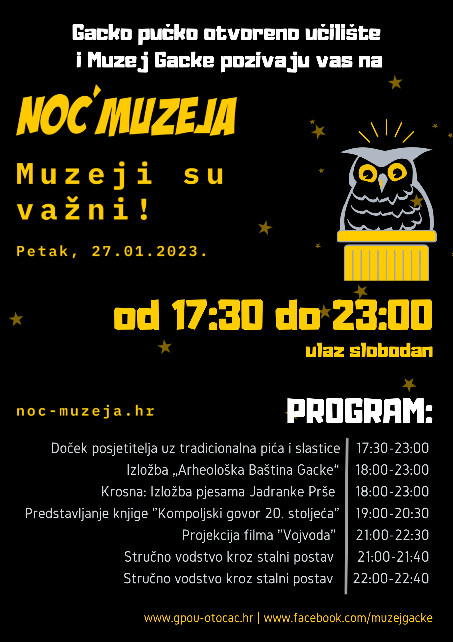 Muzej Gacke svoja vrata otvara u 17:30 uz ponudu tradicionalnih pića i slastica. U 18 sati bit će otvorene dvije izložbe u prizemlju zgrade: „Arheološka baština Gacke“, izložba posvećena bogatoj arheološkoj povijesti na kojoj će biti predstavljeni do sada neizlagani predmeti i „Krosna: Izbor pjesama Jadranke Prše“, izložba posvećena prvoj zbirci pisanoj na gackoj čakavštini, tj. posvećena gackim čakavskim govorima koji su od 2018. upisani u Registar kulturnih dobara RH.