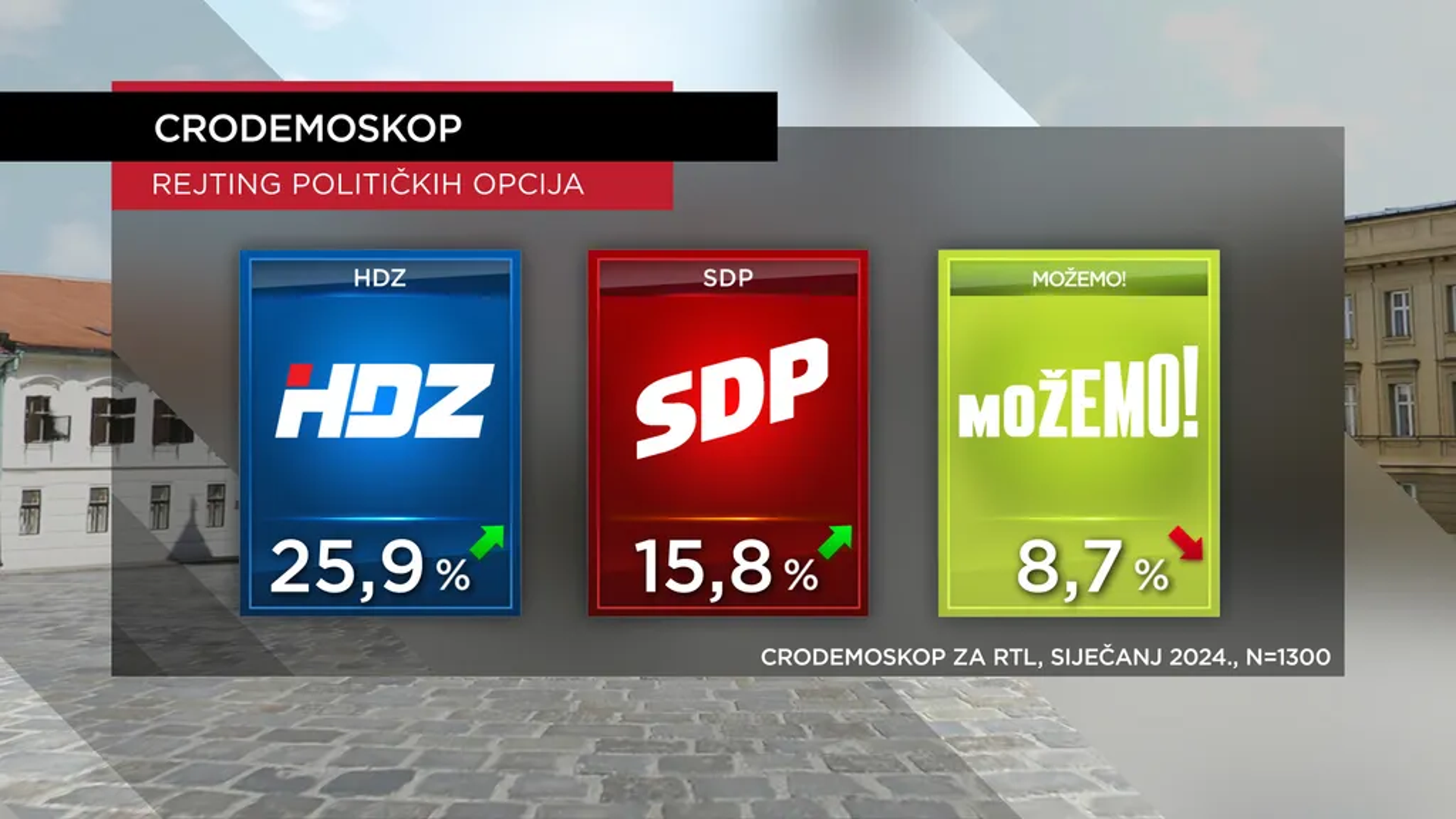 Prema najnovijima rezultatima CRO Demoskopa koje donosi RTL u suradnji s Promocijom plus vladajući imaju najviše šanse za nastavak vladavine. HDZ je uvjerljivi pobjednik s gotovo 26 posto potpore (siječanj 25,9 posto – prosinac 25 posto) uz rast u odnosu na kraj godine. Raste i SDP, no oni su na 15,8 posto (prosinac 15,5 posto). Možemo! pada treći mjesec zaredom, sada su ispod 9 posto (siječanj 8,7 posto – prosinac 9,1 posto).