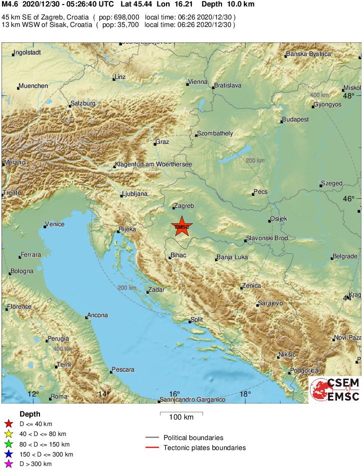 13 km WSW of Sisak, Croatia / pop: 35,700 / local time: 06:26:40.4 2020-12-30
