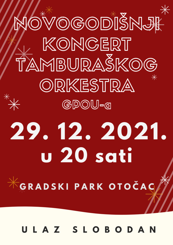 Tradicionalni novogodišnji koncert Tamburaškog orkestra Gackog pučkog otvorenog učilišta održat će se u srijedu, 29. 12. 2021. godine u gradskom parku u Otočcu s početkom u 20 sati. U programu će uz Tamburaški orkestar nastupiti i gosti. Ulaz je slobodan!