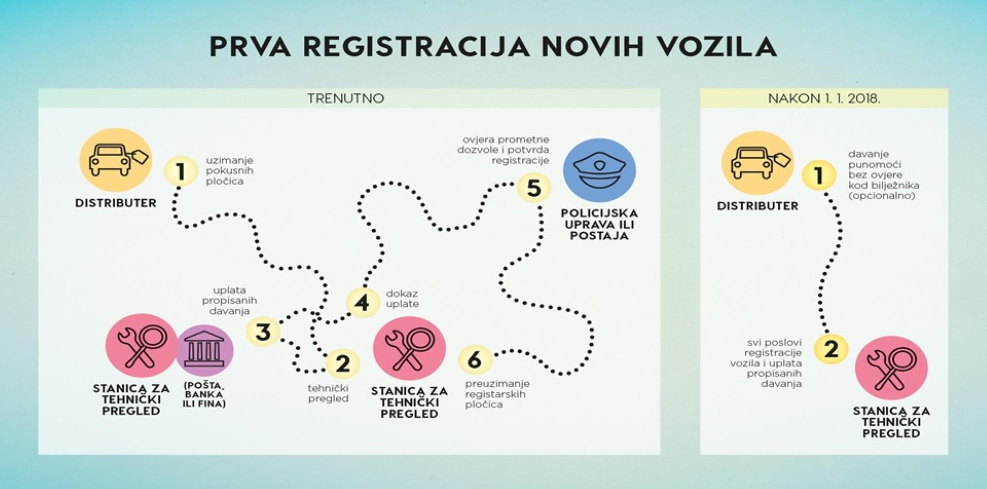 Prvu registraciju vozila sada je moguće obaviti u stanici za tehnički pregled koja nije u registracijskom području u kojem vlasnik ima prebivalište, boravište ili sjedište. Ali registarske pločice moraju imati oznaku registracijskog područja u kojem je prebivalište, boravište ili sjedište vlasnika vozila.