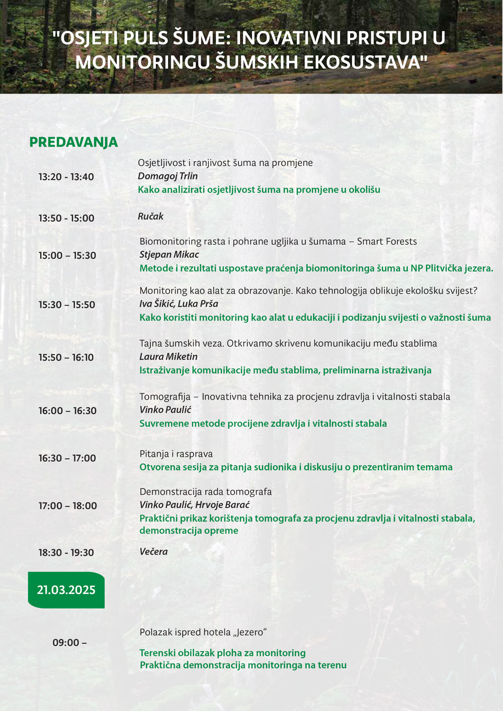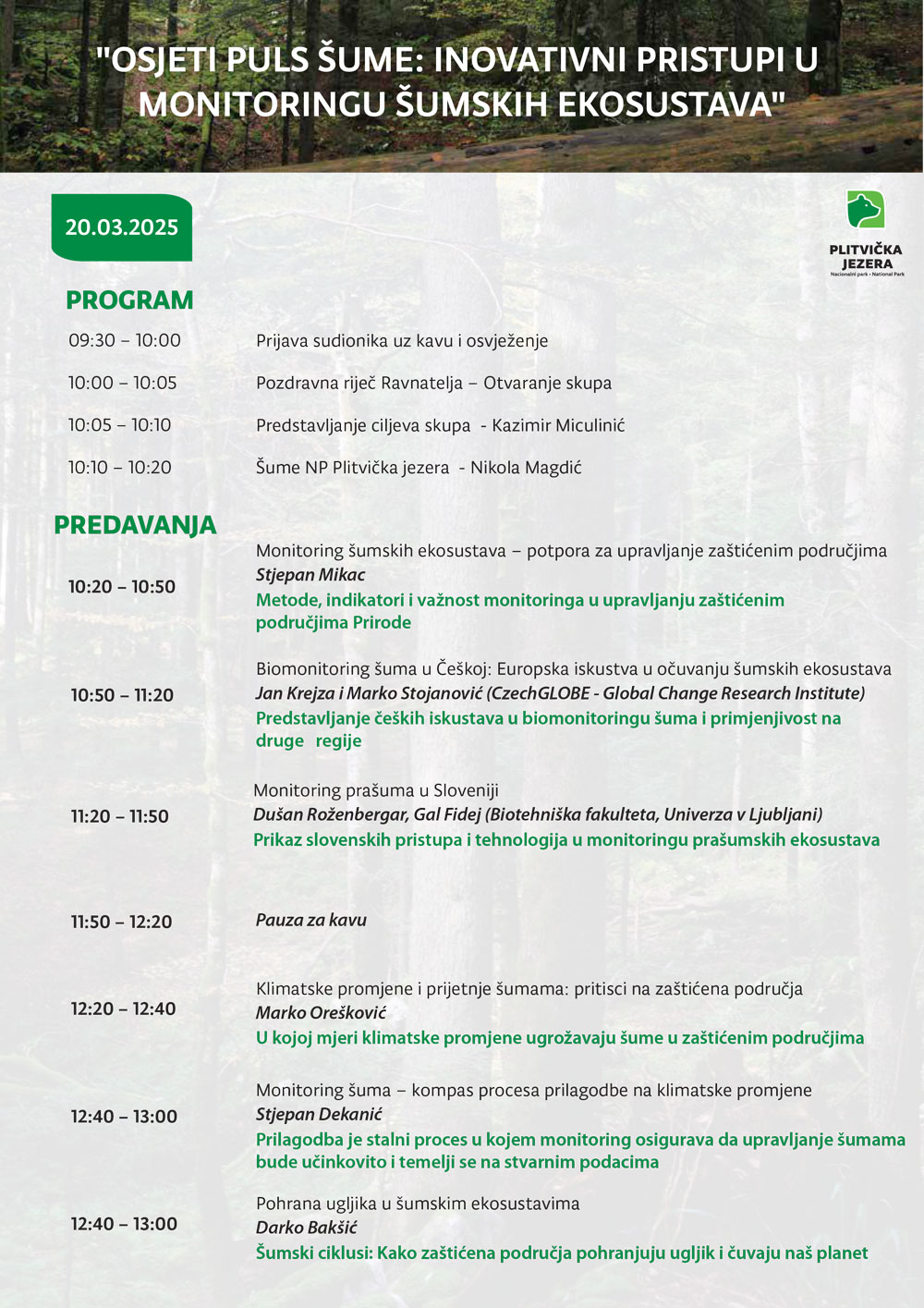 Dana 20. i 21. ožujka 2025. godine u Kongresnoj dvorani hotela „Jezero“ u Nacionalnom parku Plitvička Jezera održat će se Stručni skup pod nazivom  “Osjeti puls šume – Inovativni pristupi u monitoringu šumskih ekosustava”.