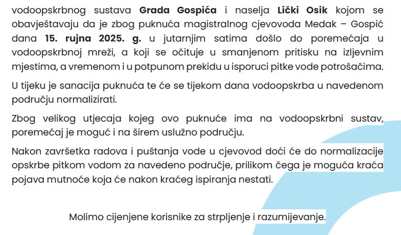 Home Gospić Obavijest korisnicima vodoopskrbnog sustava Grada Gospića GospićvijestiZanimljivosti Obavijest korisnicima vodoopskrbnog sustava Grada Gospića By Nikola Mraović - 15 rujna, 2025 0 Facebook Gs Press / Ličke vode RELATED ARTICLESMORE FROM AUTHOR Odgovor saborskog zastupnika Zvonimira Troskota gradonačelniku Gospića Darku Milinoviću Otkrivene lokacije na kojima se ove godine vozi svjetski spektakl WRC Croatia Rally Demantij Milinovića: „Gospodine Troskot pločice u ramenu je lako mijenjati, ali opasne su one u glavi“ Predstavnici Savjeta mladih LSŽ posjetili OB Gospić povodom Svjetskog dana bolesnika Biskup Marko Medo predvodio misno slavlje i blagoslovio Opću bolnicu Gospić