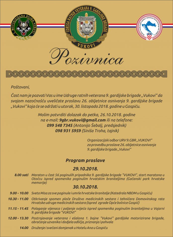 Poštovani suborci Vukovi i članovi vaših obitelji u ponedjeljak i utorak 29. i 30. 10. obilježit ćemo 26. obljetnicu ustrojavanja legendarne 9. GBR VUKOVI.