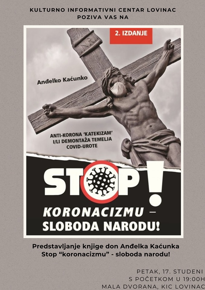 S početkom u 19:00h u maloj dvorani Kulturno informativnog centra Lovinac održat će se predstavljanje knjige „STOP KORONACIZMU – SLOBODA NARODU“ autora don Anđelka Kaćunka.