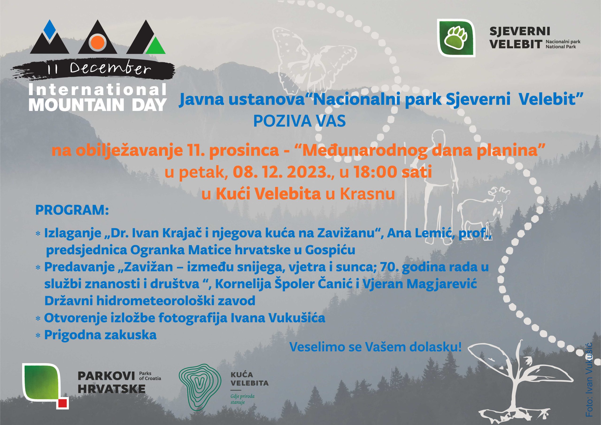 Povodom obilježavanja 11. prosinca – Međunarodnog dana planina, Javna ustanova Nacionalni park Sjeverni Velebit poziva Vas u petak, 08. prosinca 2023., od 18:00 sati u Kuću Velebita u Krasno na prigodni program i druženje.