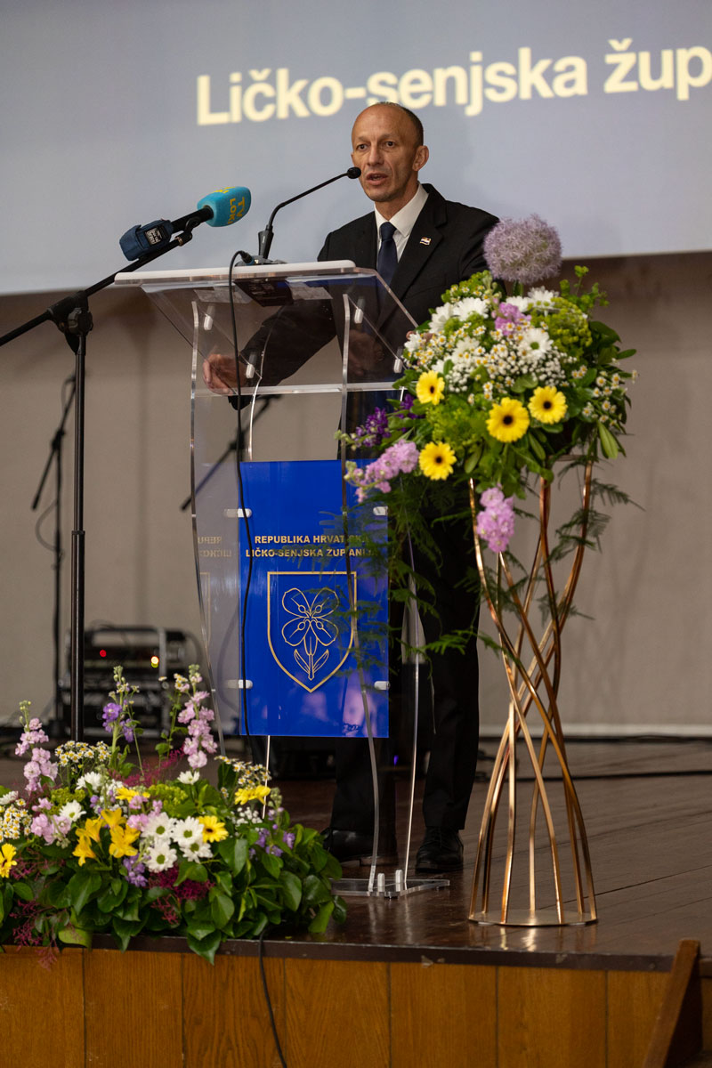 “Ovim putem kao ličko-senjski župan svima vama i građanima koji danas nisu s nama, želim u svoje osobno ime i u ime svih zaposlenika Ličko-senjske županije sretan naš dan, Dan Ličko-senjske županije, dan rođenja dr. Ante Starčevića, Oca Domovine, na kojega svi smo ponosni, kako danas, tako i u prošlosti i proteklih 202 godine. Dragi moji sumještani, drage moje Gospićanke i Gospićani, dragi stanovnici Ličko-senjske županije, mogu kazati da smo protekle četiri godine proveli preko 350 različitih projekata u suradnji sa svima vama, predstavnicima jedinica lokalne samouprave, predstavnicima javnih ustanova, ali sve to ne bi bilo moguće bez vrijednih zaposlenika Ličko-senjske županije i podrške resornih ministarstava i Vlade Republike Hrvatske, na čemu se i ovom prilikom zahvaljujem. Još jednom mogu kazati da se Ličko-senjska županija razvijala ravnomjerno u sva četiri grada i svih osam općina naše županije, kako bi poboljšali kvalitetu života na ovim prostorima i demografsku sliku. Mogu istaknuti da smo za nadolazeće razdoblje pripremili preko 500 novih radnih mjesta koja će biti ostvarena u cijeloj županiji, naravno opet uz podršku Vlade RH, izgradnjom novih proizvodnih pogona, ustanova i smještajnih kapaciteta. U suradnji s Vladom uloženo je preko 350 milijuna eura u razvojne projekte koje ste djelomično imali priliku vidjeti i kroz današnje prikaze. Također, svima je danas podijeljeno i izvješće župana Ličko-senjske županije u kojem je nabrojano oko stotinjak projekata od ukupno 350 koje smo realizirali. Županija nastavlja istim smjerom, spremna za nove projekte i u suradnji s općinama, gradovima i državom. Dobrodošli u Gospić i našu ponosnu županiju i još jednom sretan vam Dan Ličko-senjske županije.”