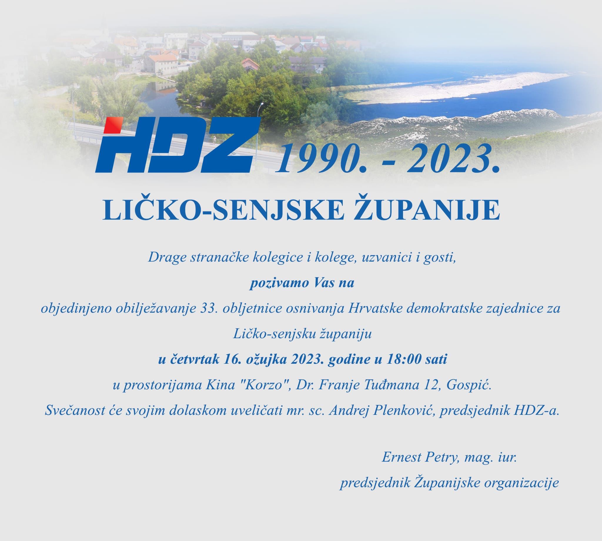 ovim putem Vas obavještavamo i ujedno pozivamo na objedinjeno obilježavanje 33. obljetnice osnivanja Hrvatske demokratske zajednice za Ličko-senjsku županiju, koje će se održati u četvrtak, 16. ožujka 2023. godine s početkom u 18:00 sati u pristorijama Kina ”Korzo” u Gospiću.