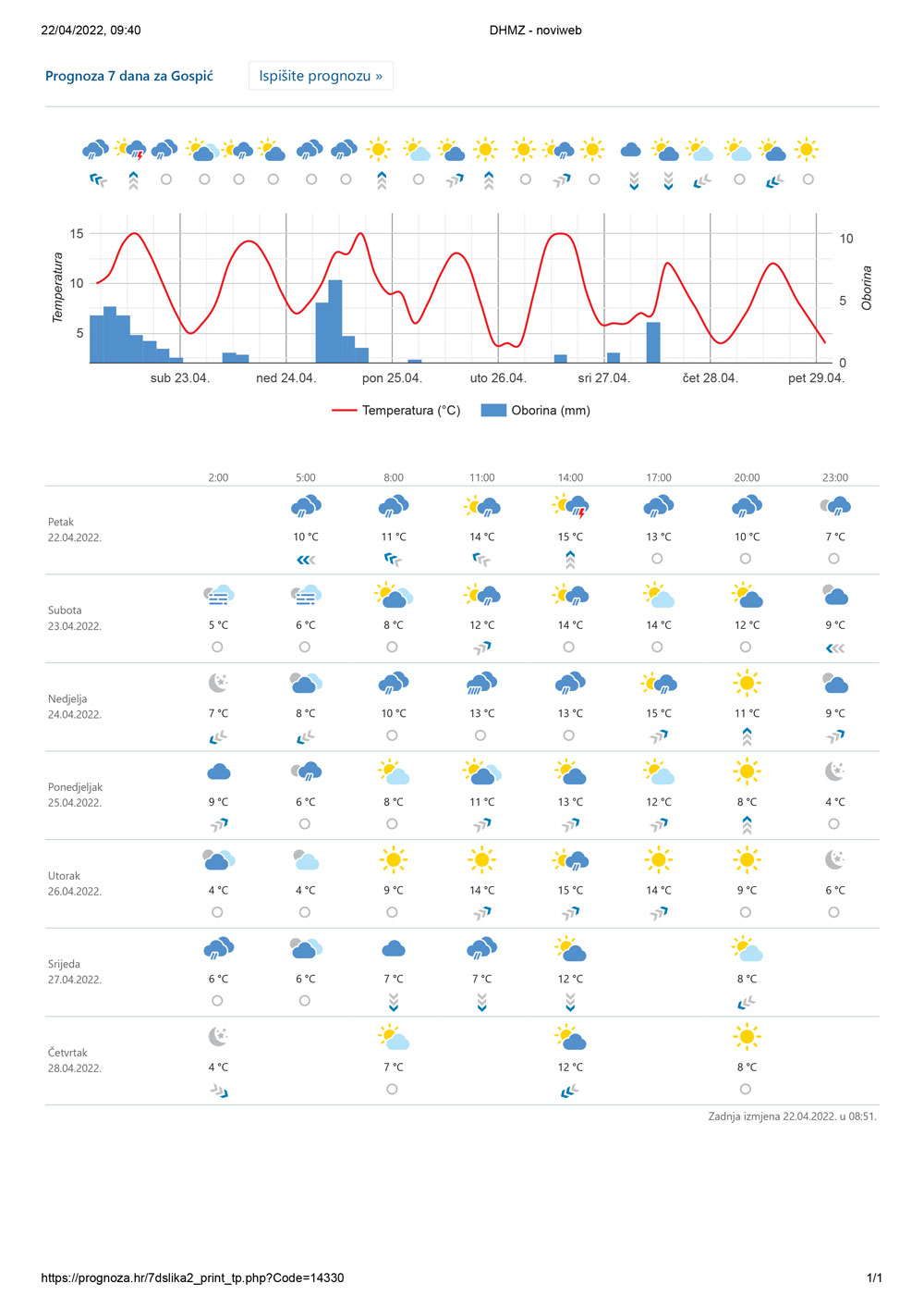 Prevladavat će oblačno s kišom, uglavnom u Lici oko sredine dana i poslijepodne moguć je i poneki pljusak s grmljavinom. Vjetar slab do umjeren sjeveroistočni, u Lici jugoistočni i južni. Najviša temperatura uglavnom između 10 i 14 °C.