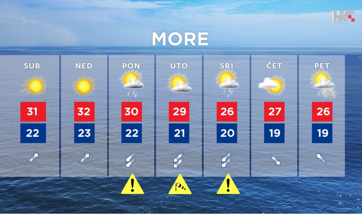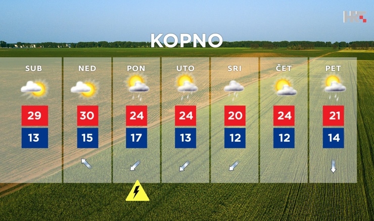 “Od ponedjeljka na kopnu oblačnije i manje toplo, najprije na zapadu, a zatim i prema istoku zemlje. Pritom povremeno kiša, ponegdje i pljuskovi s grmljavinom – već u noći na ponedjeljak i prijepodne u ponedjeljak, a u Slavoniji većinom u drugom dijelu dana”, stoji prognozi za HRT.
