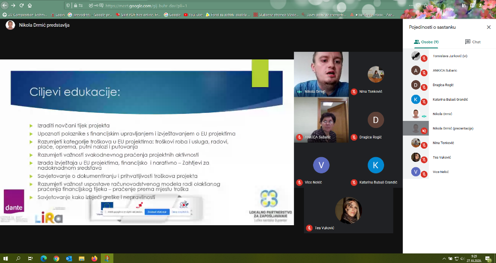 Edukacija na temu „Financijsko praćenje unutar provedbe projekata financiranih iz EU“ namijenjena članovima Lokalnog partnerstva za zapošljavanje (LPZ) održana je 27. listopada 2020. godine u organizaciji LIRA-e.