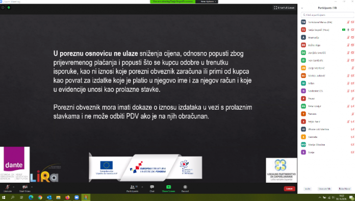 Dana 30. listopada 2020. godine u terminu od 09:00-15:00 sati putem online aplikacije održana je radionica nezaposlenim pripadnicima ranjivih skupina s područja Ličko-senjske županije pod nazivom: „Osnove poreznog sustava Republike Hrvatske“.