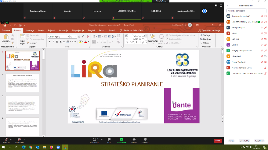 U sklopu projekta „Lokalno partnerstvo za zapošljavanje Ličko-senjske županije“, 23. listopada 2020. godine održana je online edukacija za članove LPZ-a na temu „Strateško planiranje“.