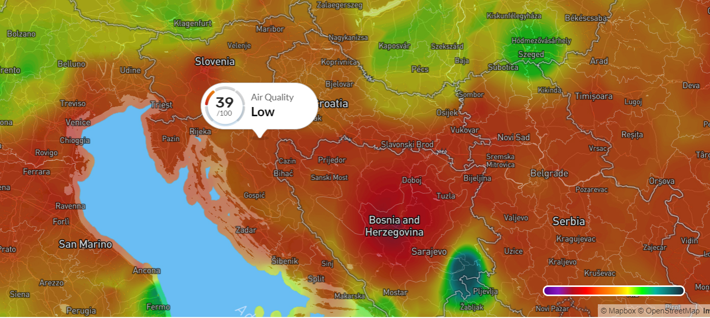 Očekivana raspodjela PM10 čestica za ponedjeljak 30.3.2020. Izvor: Ventusky