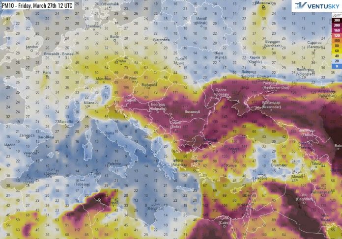 Očekivana raspodjela PM10 čestica za subotu 28.3.2020. Izvor: Ventusky