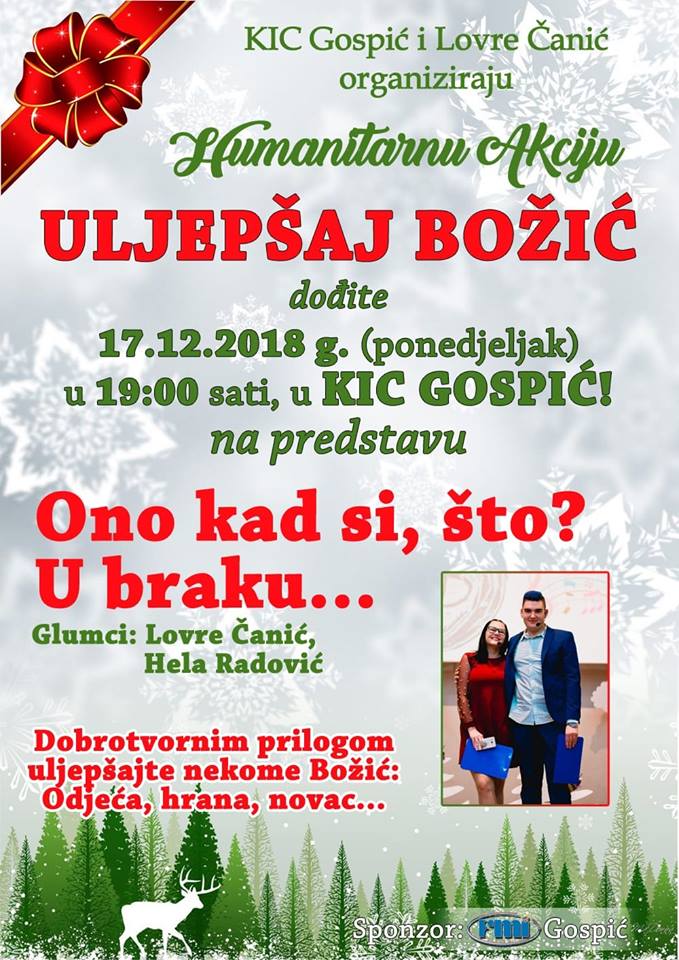 KIC Gospić i Lovre Čanić organiziraju Humanitarnu akciju: “Uljepšajmo Božić” 17.12.2018. u 19:00 sati dođite pogledati predstavu “Ono kad si, što? U braku…” U Kulturno informativnom centru Gospić. U predstavi glume Hela Radović i Lovre Čanić.