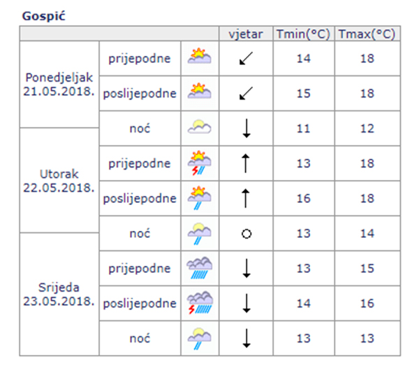 Lokalno mogući izraženiji pljuskovi s grmljavinom. vjerojatnost grmljavine 50-70% BUDITE NA OPREZU zbog mogućih jačih grmljavinskih nevremena. Posebno pripazite u izloženim područjima kao što su planine, šume i livade odnosno otvoreni tereni. Mogući su prekidi u aktivnostima na otvorenom.