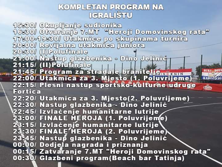 Program turnira službeno starta danas od 19:30 sati polaganjem vijenaca i paljenjem svijeća na gradskom groblju kod crkve sv. Karla. Nakon toga slijedi misa zadušnica za sve stradale Heroje Domovinskog rata u crkvi sv. Josipa, a od 21 sat kreće izvlačenje skupina malonogometnog turnira.