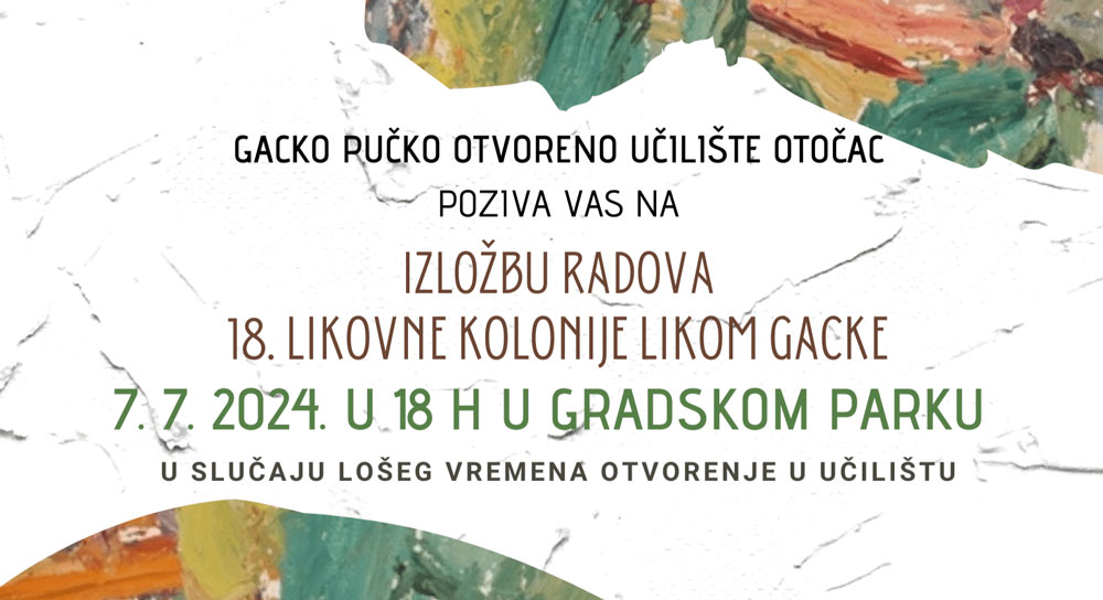 Pozivamo Vas na otvorenje “Izložbe radova 18. likovne kolonije LIKOM GACKE” koje će se održati u nedjelju, 7. srpnja 2024. godine u 18 sati u gradskom parku u Otočcu.