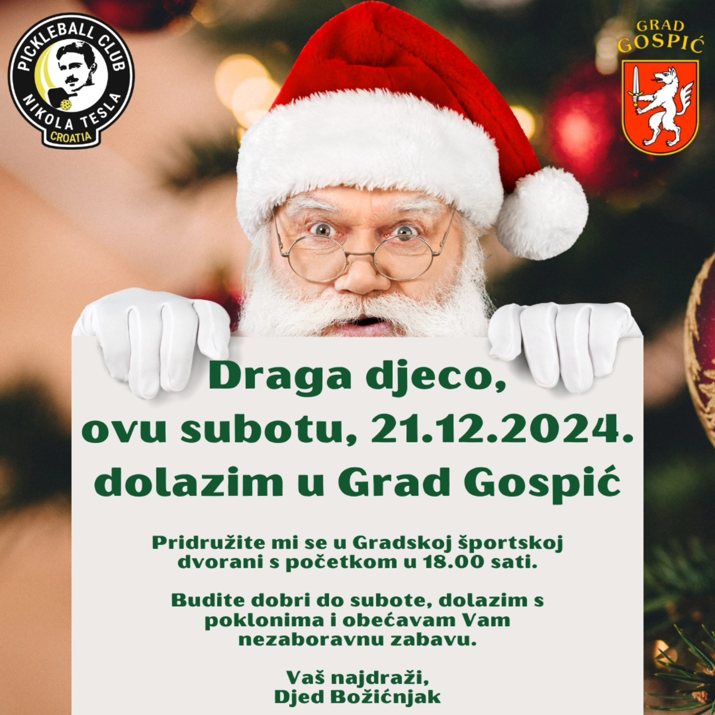 Ove subote, 21. prosinca 2024. u 18 sati, u Gradsku športsku dvoranu u Gospiću stiže poseban gost – Djed Božićnjak! Zahvaljujući suradnji Pickleball cluba Nikola Tesla Croatia i Grada Gospića, najmlađi će imati priliku upoznati omiljenog djedicu i uživati u posebnom programu.