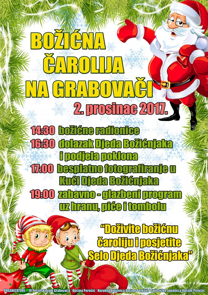 Prve adventske subote ove godine, 2. 12. Javna ustanova „Pećinski park Grabovača“ u suradnji s Narodnom knjižnicom Perušić, Općinom Perušić i Turističkom zajednicom Perušić organizira Božićnu čaroliju na Grabovači. Ovaj događaj je zamišljen kao uvod u predbožićno raspoloženje s posebnim naglaskom na djecu koja su glavni razlog ovome događanju. Cijela priča naći će svoje mjesto u Selu Djeda Božićnjaka u kojem smo uz pomoć vrijednih djelatnika parka djedičinu čaroliju iz Finske uspjeli preseliti na Grabovaču. Božićne radionice za djecu bit će organizirane u pravoj radionici Djeda Božićnjaka, a zatim šetnjom kroz začaranu šumu prepunu sobova djeca će se moći uputiti u pravu poštu Djeda Božićnjaka kako bi njihove želje došle na pravu adresu. Osim toga, predviđen je i sam dolazak Djedice, podjela poklona i fotografiranje u najpopularnijoj božićnoj fotelji uz kamin i pravi blagdanski ugođaj. Za dobro raspoloženje pobrinut će se vilenjaci i vilenjakinje koji će raditi pod budnim okom bake Mrazice. U kasnijim popodnevnim satima predviđen je zabavno-glazbeni program uz neizostavno kuhano vino iz kojeg će se širiti pravi blagdanski mirisi, kuhane kobasice i tamburaše. Nakon podjele poklon, prodavat će se i vrijedne tombole koje su nam osigurali vjerni sponzori.