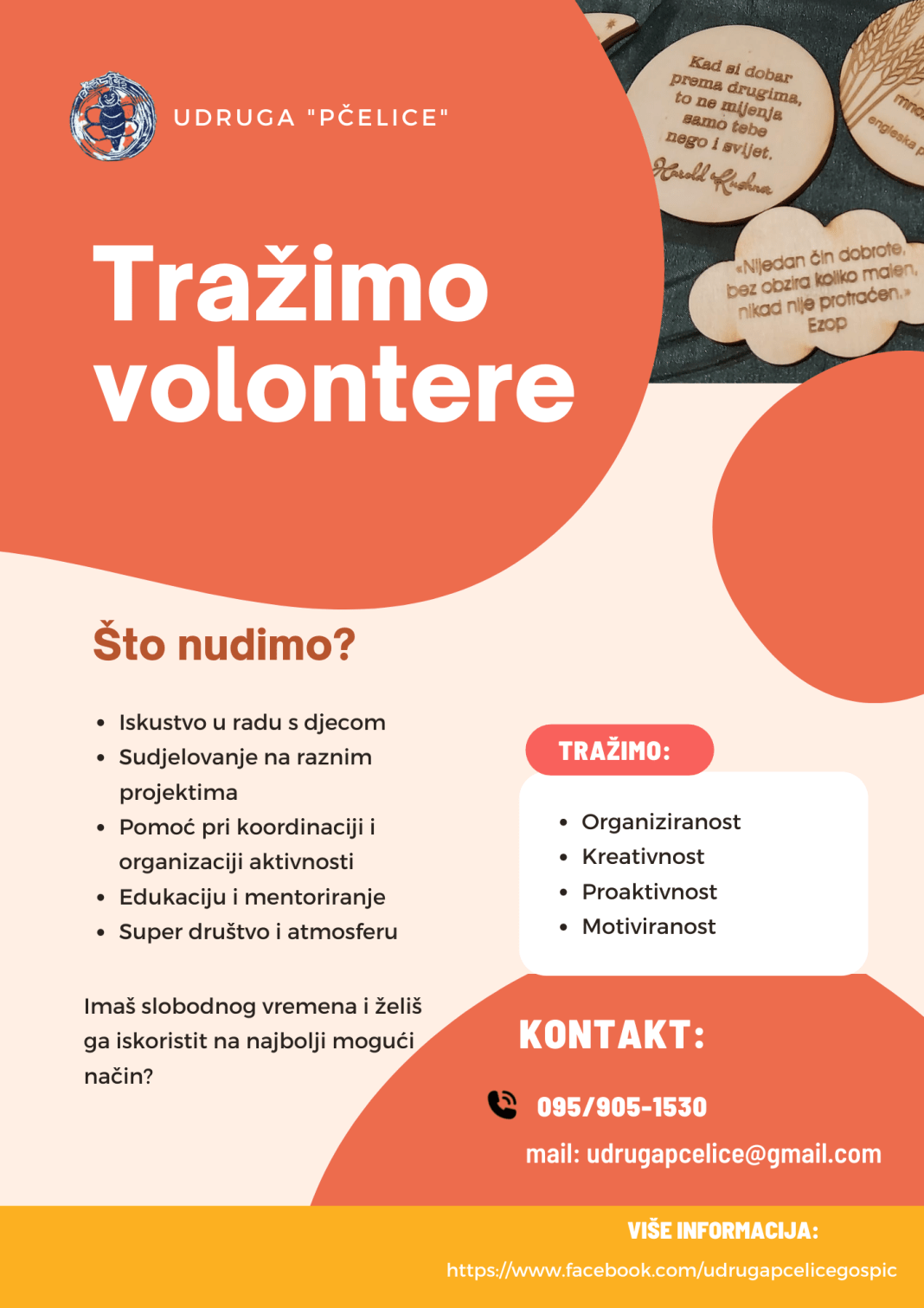 Pozivamo stoga naše drage sugrađane koji žele biti aktivno uključeni u aktivnosti volontiranja u „Pčelicama“ da nam se jave. Trebaju nam volonteri koji će redovito pružati podršku djeci s teškoćama u razvoju tijekom različitih aktivnosti poput tzk-a ili različitih radionica na kojima će djeca stjecati osnovne komunikacijske, matematičke, IKT i druge vještine. Sudjelovanjem u vođenim aktivnostima te u radu s korisnicima volonteri stječu dragocjena iskustva i vještine, ali i razbijaju osobne predrasude. Bitno je shvatiti da djeca s teškoćama u razvoju imaju svoj put razvoja koji se redovito ostvaruje, ali u nekim područjima možda malo sporije nego kod djece urednog razvoja. Ono čime nas naši korisnici osvajaju jest otvorenost, ljubav, povjerenje i podrška koju međusobno pružaju jedni drugima, ali i svima koji ih vode kroz aktivnosti i daju im podršku. Kako se povećava opseg rada s korisnicima doista nam je neophodna pomoć i podrška volontera. Ukoliko želite kroz volontiranje dati svoje dragocjeno vrijeme i znanje korisnicima „Pčelica“ javite se na broj mobitela – 095/905-1530 (Željka Šikić) SMS porukom. Naši volonteri sklapaju volonterski ugovor s Udrugom „Pčelice“ te svojim radom i aktivnošću volonteri stječu potvrde o volontiranju i stečenim kompetencijama.